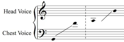 Voice: in bass clef. (If using extended passages in head voice, then a treble clef is appropriate.)