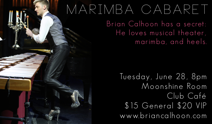 See what happens when a classically-trained percussionist with musical theater sensibility --and killer taste in shoes-- puts on a show. Brian’s Marimba Cabaret brings together years of training and a lifetime of passion in an evening of theater tunes, art song, and pop covers performed on marimba, vibraphone, and voice.